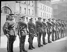 Early in the war 24 reserve cavalry regiments were formed to provide training to recruits for the cavalry and yeomanry regiments.[34] Only four of them saw any combat—the 6th, 8th, 9th, and 10th Reserve Cavalry Regiments—all during the 1916 Easter Rising in Dublin.[35][36] The 6th Reserve Cavalry Regiment, with 35 officers and 851 other ranks, was the largest unit then available to Dublin commander Brigadier General William Lowe of the 7th Dragoon Guards.[37][38][39]