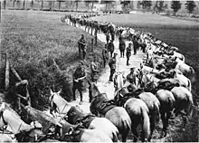 To look after the regiment's horses, attached to the regimental headquarters, was a veterinary officer, a quartermaster sergeant farrier (also responsible for killing wounded or sick horses), a saddler sergeant, and a saddle-tree maker. Each squadron had two saddlers, one a sergeant, and each troop had a shoeing smith.[84][87] The regiment had 528 riding horses, 74 draught horses, six pack horses, 18 carts or horse-drawn wagons, and 15 bicycles.[57]