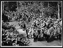 Following the Boer War there were calls for the disbandment of the cavalry by such notable persons as the Commander-in-Chief of the Forces Lord Roberts and Sir Arthur Conan Doyle.[15] Between 1900 and 1903 the cavalry's share of the army budget was cut from six to under 4.5%, and recruiting for the cavalry was suspended for a year.[16] Added to this, the Commonwealth Defence Act 1903 proposed a force of nine brigades formed by a militia, with six of the brigades planned to be mounted infantry known as light horse.[17] In the same year, Lord Roberts appointed Robert Baden-Powell of the 5th Dragoon Guards to the position of Inspector General of Cavalry, a surprising choice as Roberts had earlier described him as being "certainly not a General".[18] Within the year, Baden-Powell was endorsing a change in policy, recommending that instead of countering an enemy charge with a countercharge of their own, the cavalry should dismount and engage them with rifle fire.[19] For cavalry to survive, by necessity British cavalry doctrine had to change, as the emphasis was now on dismounted firepower and cavalry charges that were supported by covering fire from the flanks, by their own machine guns, and the guns of the Royal Horse Artillery (RHA).[20] To support this change in policy, cavalrymen were now required to do two hours rifle or sword practice a day.[21] This made them just as proficient as the infantry with their rifles. In 1908 one regiment, the 14th Hussars, recorded having 354 marksmen, 212 first class shots, 35 second class, and only four third class shots.[22]