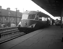 An early petrol railcar was the 1903 Petrol Electric Autocar built by the North Eastern Railway. In 1914 the London and North Western Railway commissioned a 90 hp (67 kW) petrol-electric railcar, although this was converted into a driving trailer in 1924. After World War I more powerful diesel engines were available and in 1928 the London Midland & Scottish Railway (LMS) commissioned a four-car diesel-electric multiple unit using a 500 hp (370 kW) Beardmore engine, similar to that used on the airship R101, placed in a power car that had been used on the Lancashire and Yorkshire Railway's electrified line from Bury to Holcombe Brook.[7] In the early 1930s Armstrong Whitworth built three railcars for the LMS, LNER and Southern Railway. These had a 250 hp (190 kW) Sulzer engine driving two GEC traction motors and could seat 60 passengers, able to pull trailers or run in multiple.[8] English Electric built a prototype railcar called Bluebird with a 200 hp (150 kW) engine.[9] In 1938 the LMS built a 3-car articulated multiple unit at Derby, with two 125 hp (93 kW) motors driving the axles using a torque converter, controlled using an electro-pneumatic system. Seating 162 including 24 first-class it ran in service between Oxford and Cambridge, but was withdrawn in 1940 due to World War II.[10]
