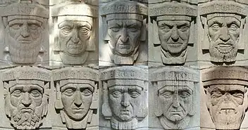 Brittain Hall's Western Side faces Techwood Drive and Bobby Dodd Stadium. This side is the only entrance for patrons and features ten Doric pillars emblazoned with stylized busts of ten famous scientific minds and the fields to which they contributed; these are fields that were present at Georgia Tech during Brittain's 1928 construction. Civil engineering, mechanical engineering, and aerospace engineering are represented by Leonardo da Vinci. Ceramics is represented by Luca della Robbia. Textiles is represented by Eli Whitney. Electrical engineering is represented by Thomas Edison. Architecture and the fine arts are represented by Michelangelo. Physics is represented by Archimedes. Chemistry is represented by Antoine Lavoisier. Mathematics and astronomy are represented by Isaac Newton. Biology is represented by Aristotle. Ecology is represented by Charles Darwin.