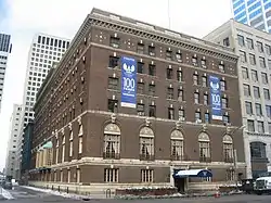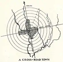 Broad Street has been one of Columbus's two main corridors since its founding, along with High Street, meeting at a 100 percent corner downtown.[2] The street has its origin before High Street and Columbus, with the 1797 founding of Franklinton. The first section of the road was constructed then, on the west bank of the Scioto River. Franklinton, then an independent settlement, had applied to be Ohio's capital. The settlement's founders were persuasive, though its flood problem led Ohio officials to choose the eastern bank of the river, on higher ground. Several streets were then laid out from the city's founding in 1812 into the following year, including Broad and High.[3] These streets and the entire grid were laid out 12 degrees off from a north–south and east–west alignment.[4] Broad Street's construction involved clearing dense forest, and tree stumps left behind caused horse-drawn carriages to maneuver around them, helping lead to the wide roadway.[3]