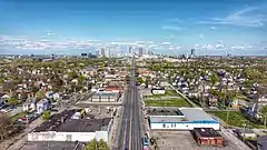 Broad Street and High Street both traverse beyond the extent of the city; High Street is the longest in Columbus, running 13.5 mi (21.7 km) (23.4 across the county), while Broad Street is longer across the county, at 25.1 mi (40.4 km).[2] The city's street plan follows a grid pattern with the intersection of Broad and High Streets at its center.[8] The address system begins its numbering at the intersection of Broad and High, with numbers increasing in magnitude with distance from Broad or High, as well as cardinal directions used alongside street names.[9]