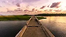 Broken Bridge is a bridge to nowhere, located in Chennai, South India. During the year 1977, the bridge partly collapsed due to strong currents of the river and has never been repaired. The bridge spans across the Adyar estuary, bordering the backend of the Theosophical Society. It was built in the late 18th century, with its construction completed in 1772. The bridge was initially built to connect Fort St. George in Chennai with the neighborhood of Saidapet across the Adyar River. Over time, the bridge fell into disuse and disrepair, earning its popular name "Broken Bridge. (However, please note that specific renovations or repairs to the bridge may have been carried out at different times since its original construction). It was built to facilitate the movement of fishermen from Santhome to Elliot's Beach over the mouth of the Adyar river.