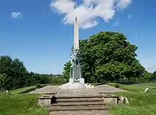 The monument includes a square obelisk constructed of Portland stone, a limestone quarried on the Isle of Portland in the English Channel. It is positioned on a base with three steps. The memorial features three bronze figures adjacent to the lower portion of the obelisk. On the fourth side of the obelisk, the back of the monument, there is a bronze cartouche. In addition, there are bronze plaques with the names of the fallen on all four sides of the base.[6] The statues include a winged Victory in the centre, with a laurel wreath. That statue is flanked by two additional bronze figures, one of Liberty with a torch and the other of Peace with flowers of remembrance.[6] The monument records the names of 769 soldiers from the area who died in World War I. It also lists the names of 476 soldiers and civilians who were killed during World War II.[7][8] The memorial was completed by the sculptor in 1922.[1]