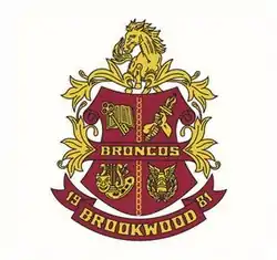 The school derived its name from its location on the intersection of Holly Brook Road (a section of this road is now Webb Gin House Road) and Dogwood Road. The school colors, maroon and gold, were based on the colors of Florida State University. The original school mascot had a horseshoe around the bronco, which was later removed. The administration had suggested that Brookwood be the Brookwood Bears. The original mascot was a drawing of an entire bronco, but the current logo uses only a bronco's head. The runner-up mascot choice was the Bruins, and the second place color scheme was baby blue and gold.