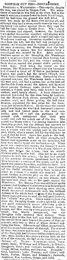 Broughty did win its first round tie in the Forfarshire that season, 6–0 against Monifieth,[13] but lost to the Harp in the second round. A measure of the difference in sides is that the Harp only scoring four goals "created much surprise amongst the spectators, and no little gratification to the friends of the Broughty."[14]