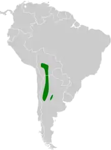 The nominate subspecies of the brown-capped tit-spinetail is found in the Bolivian Andes between the west-central department of La Paz and the southern Potosí and Tarija departments. Subspecies L. f. paranensis is found in the Andes of northwestern Argentina from Jujuy and Salta provinces south to Mendoza, Córdoba, and San Luis provinces. The species inhabits a variety of landscapes including arid, semi-humid, and humid montane scrublands; Polylepis woodlands; and semi-humid woodlands. In scrublands if favors steep ravines. In elevation it mostly ranges between 1,500 and 3,900 m (4,900 and 12,800 ft) in Bolivia and between 1,000 and 2,500 m (3,300 and 8,200 ft) in Argentina.[3][4]