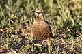 Male brown songlarks are 23–25 cm long versus 18–19 cm for females, and may weigh 2.3 times as much.[7] The average weight of males was listed as 74.8 g (2.64 oz) and that of females is 32.4 g (1.14 oz).[8] They are probably the most sexually dimorphic passerine in the world in size difference, as well as likely the largest species in the family Locustellidae.[9] In general, the birds have a dusky pale-streaked with darker brown plumage and pale eyebrows. The underparts are brownish-white in the female, darker brown in the male. Breeding males may display a cinnamon colour. The eyes and bill are black, and the legs grey. Juveniles are smaller and paler with pinkish-brown bills. The call has been described as loud and creaky.[10] The male is the principal singer, calling from perches or when rising above breeding territory.[11]