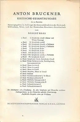 This first edition (12 volumes issued)[2][3] included 'hybrid' scores for Symphonies Nos. 2 and 8 and other similar conflations for some other revised works (Mass No. 3). - Neue Gesamtausgabe (1951–1989, Editorial Head: Leopold Nowak)