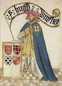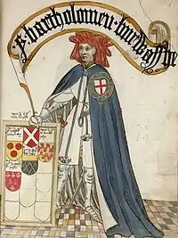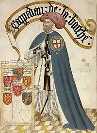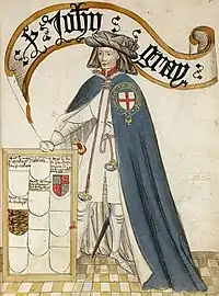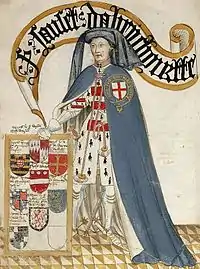 The Bruges Garter Book is a 15th-century Anglo-Norman illuminated manuscript containing portraits of the founder knights of the Order of the Garter.[1] It was created sometime between about 1430 to 1440, probably in London,[2] to the order of William Bruges (c. 1375–1450), Garter King of Arms, and constitutes the first armorial covering members of the Order. It has been held since 1883 by the British Library (formerly the British Museum Library) in London under catalogue reference Stowe MS 594, indicating its former existence within the Library of the Dukes of Buckingham at Stowe House.