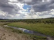 The Bruneau River emerges from the plateau and canyon region 16 miles (26 km) upstream from its mouth at the Snake River's C. J. Strike Reservoir. At this point, the river enters the broad and fertile Snake River Plain. This lower section of the watershed is occupied by farms and ranches, and the town of Bruneau.[2]