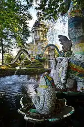 Also thousands of mosaic tiles adorn the sculptures of Bruno Weber. At the estate's own water source, opposite of the Weber house, in the early 1970s the artist built a fountain called the Source Goddess. It is one of the first concrete sculptures made by Weber, and he called it "his Indian character".[3]