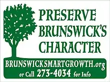 One of the main issues coming from Brunswick Smart Growth and town residents was concerns regarding overdevelopment of the town in a short period of time; their argument was for "sustainable and positive growth".[26] Many cited the arguable overdevelopment of Clifton Park, a town located roughly 14 miles (23 km) to the northeast.[27] Brunswick Smart Growth became noticeable after many residents placed signs on their lawns.