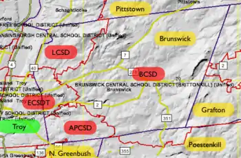 Brunswick is part of five school districts: Averill Park, Brittonkill, Lansingburgh, Troy, and Wynantskill