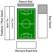 Brunton Park is split into four separate stands: Warwick Road End, East Stand, Main (West) Stand and the Petteril End, which remains closed unless exceptionally large crowds are in attendance.