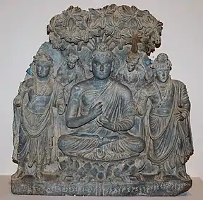The Brussels Buddha is a famous Buddha statue from the Greco-Buddhist art of Gandhara.[1] It is named after the first collection to which it belonged, the Claude de Marteau collection in Brussels, Belgium, although it is now in a private collection in Japan, belonging to the Agonshū sect of Buddhism.[1] The Brussels Buddha belongs to the category of the "Seated Buddha triads", which can be seen contemporaneously in the Greco-Buddhist art of Gandhara and in the art of Mathura in the early Kushan period.[2] The precise location where the statue was discovered is unknown, but it was acquired in Peshawar, and it is thought to have been excavated in Sahri Bahlol due to its similarity with a statue from the same location, now in the Peshawar Museum.[3]