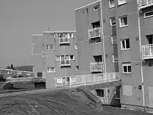 The Gleadless Valley project is an expansive complex of 36 six-storey tower blocks (of which 22 still exist) located throughout the wider Gleadless Valley Redevelopment Area, between the related Callow Mount and Herdings Twin Towers developments. The Gleadless Valley blocks were completed between 1955 and 1962[4] by a consortium consisting of H. Dernie Construction and direct municipal labour groups belonging to what was then the Sheffield County Borough Council.[5] The blocks of flats are located quite widely across the development area, with a ring of them lining the outer side of Blackstock Road (four blocks), Gaunt Road (13) and Ironside Road (11) while the inner sides and areas confined by these three roads are largely covered by low-rise housing. An additional row of eight largely identical blocks were constructed 0.25 mi (0.40 km) away on Raeburn Road, next to Herdings Park. Each block is largely identical inside, containing twelve dwellings for a total of 432 residencies across the complex as-built.[5]