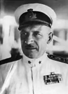 After the end of the war he commanded several torpedo boats, was promoted lieutenant commander on 1 July 1922 and became executive officer of the protected cruiser Campania.[2] On 30 July 1926 he became commander, and in the subsequent years he was given command of the destroyers Rosolino Pilo, Daniele Manin and Insidioso.[1] Before taking command of the training ship Cristoforo Colombo in March 1930, he held the post of Chief of Staff of the 1st Destroyer Division.[1] He then spent a brief period in shore assignments at the Ministry of the Navy[1] and in command of the schools of the Royal Corps of Naval Crews (Corpo Reali Equipaggi Marittimi, C.R.E.M.) at the Varignano naval base (La Spezia).[2] On 1 November 1932 he was promoted to captain and assumed the post of Chief of Staff of the 1st Naval Squadron and then, between 1934 and 1936, he commanded the heavy cruiser Bolzano.[2]