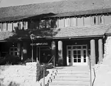 The two-story lodge is built on a stone base with intentionally oversized log framing, creating a massive, rustic appearance. The central portion of the building dates to 1924, with the addition of the north and southeast wings taking place in 1926. The lodge is entered by a long porch fronting the entire lobby, whose roof rests on a 52-foot (16 m) long log beam supported by paired log columns. The lodge is capped by a heavy, steeply-pitched shingled roof with clipped gables and shed dormers.[2][3][4]