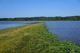 Buckhorn Reservoir is a reservoir in Wilson County, North Carolina, USA, created by the Buckhorn Dam. The reservoir is the primary water supply for the city of Wilson. The original Buckhorn Dam was built in 1974, 1,000 feet (300 m) upstream from the current dam.[1] The reservoir at that time only had the ability to contain 800 million US gallons (3,000,000 m3) of water. In 1999, a new dam was constructed downstream from the older dam creating a reservoir with a much larger capacity. The new Buckhorn Reservoir covers an area of 2,300 acres (9.3 km2), and has a capacity of 7 billion US gallons (26,000,000 m3) when fully filled.