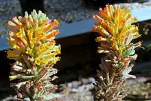Buddleja tubiflora grows to < 2 m in height, with the typically lax habit creating a spread of < 3 m. The shrub is chiefly distinguished by its striking orange flowers, the corollas 25 mm long by 6 mm wide at the throat, borne in axillary clusters towards the ends of the branches. The branchlets, like the corolla tubes, are covered in a dense reddish indumentum. The leaves are mostly subsessile, lanceolate to ovate-lanceolate, 8 – 18 cm long by 2 – 6 cm wide, membranaceous, tomentulose above, tomentose below. Pollination is by hummingbirds which feed on the sweet nectar at the base of the corolla. Ploidy: 2n = 38.[2]