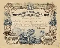 The railway's importance had already been pointed out by Juan Bautista Alberdi, who wrote in his work Basis and starting point for the Political Organization of the Argentina Republic that "the railway is the means of turning around what the colonizing Spaniards did on this continent".[3] Domingo Faustino Sarmiento and Justo José de Urquiza had also defended the idea. On 17 September 1853 the above-mentioned Railway Society, formed by a group of traders, conscious of the progress in communications which its construction would lead to and the demonstration of power it would represent, requested the grant for constructing a railway which would serve both passengers and cargo and whose cars would be pulled by a steam engine. However, in 1854, when work was about to begin, the Society asked to be exempted from using steam engines arguing that it would be more convenient "to use horses, so cheap in this country, instead of coal, which is so expensive" (this method of powering trains had already been used in Europe). The motive behind this request is not clear, but it may have been because most of the population had never seen a locomotive and believed that this would be dangerous for the surrounding buildings because of the resulting vibration, or perhaps the company considered locomotives to be too costly and the expected number of passengers were low. It must be taken into account that the western railway had no financial guarantee of minimum earnings, as the soon-established British railways would have (among other benefits). They would only earn what they obtained from their own activities. In any case, steam engines were finally purchased.