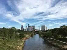 Buffalo Bayou is a slow-moving body of water which flows through Houston in Harris County, Texas. Formed 18,000 years ago, it has its source in the prairie surrounding Katy, Fort Bend County, and flows approximately 53 miles (85 km) east through the Houston Ship Channel into Galveston Bay and the Gulf of Mexico.[2] In addition to drainage water impounded and released by the Addicks and Barker reservoirs, the bayou is fed by natural springs, surface runoff, and several significant tributary bayous, including White Oak Bayou, Greens Bayou, and Brays Bayou. Additionally, Buffalo Bayou is considered a tidal river downstream of a point 440 yards (400 m) west of the Shepherd Drive bridge in west-central Houston.[3]