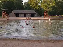 Buffalo River State Park was created in the late 1930s, taking advantage of federal job creation programs during the Great Depression. The Moorhead Rod and Gun Club championed the site and the Minnesota Legislature officially added it to the state park system in 1937.[6] At the time it was the only state-owned recreational facility in the region.[5] The Works Progress Administration (WPA) established a camp and began developing the park's original 122 acres (49 ha). WPA workmen established infrastructures like the swimming area, entrance road, parking area, water supply, and toilets.[6] They also built a bathhouse, a latrine, and a diversion dam in the National Park Service rustic style using split stone and logs.[5]
