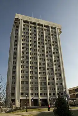 By floor count and height above ground level, the tallest building is the 18-floor Patterson Office Tower, consisting mostly of faculty and administrative offices. Demolition of the previous tallest buildings, the 23-story Kirwan Tower and Blanding Tower, parts of the former Kirwan-Blanding Residence Hall complex, began in May 2020.[1][2] Even before the demolition of Blanding and Kirwan Towers, the Patterson Office Tower reached the highest altitude of any campus building because it sits on one of the highest points of the university. All three high-rises were built in the mid-1960s.