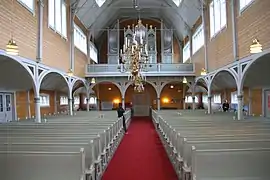 Planning for a new church began soon after. It was decided to build the new church in another part of the churchyard, about 150 metres (490 ft) to the west of the old church site. Drawings for the new building were designed by Karl Norum and were approved on 6 February 1904. Site work and construction soon began and it was consecrated on 22 November 1905 by Bishop Peter W. K. Bøckman. This red, wooden church was built in dragestil ("Dragon style"), a popular design in early 20th century Scandinavia. The old church was torn down after the fire and that area was used to expand the graveyard. Electric power and heat were installed after World War II. The church was renovated in 1965-1967 when some structural defects were corrected.[6][7]