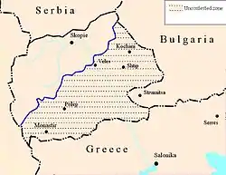 The second important document was a secret annex to the Treaty of Alliance. It specified the territorial acquisitions that Germany guaranteed to Bulgaria: the whole of Vardar Macedonia, including the so-called contested and uncontested zones, plus the part of Old Serbia to the east of the Morava river.[67] In case Romania or Greece attacked Bulgaria or its allies without provocation, Germany would agree to Bulgarian annexation of the lands lost to these countries by the Treaty of Bucharest of 1913, and to a rectification of the Bulgarian-Romanian border as delimited by the Treaty of Berlin of 1878. In addition, Germany and Austria-Hungary guaranteed the Bulgarian government a war loan of 200,000,000 francs and in case the war lasted longer than four months, they guaranteed an additional supplementary loan.[67]