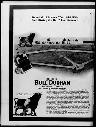 When the brand was in American Tobacco’s control, they continued Blackwell’s success with advertising and implemented even more innovative campaigns. To do this American Tobacco Co wisely made the connection between baseball, America’s favorite pastime, and tobacco.[14] The connection came naturally, as during the early 1900s tobacco was a widely used amenity during games by the players. It is believed that this close link between Bull Durham and Tobacco may have triggered the creation of such words as bullpen.[1] American Tobacco’s baseball advertisements made Bull Durham seem safe and familiar to baseball fans around the nation.