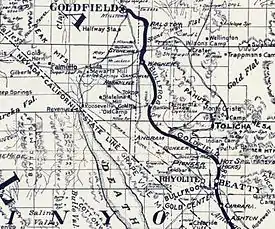 ![]() Map showing the line of the Bullfrog Goldfield Railroad and the Tonopah and Tidewater Railroad, approx. 1907. | ||||||||||||||||||||||||||||||||||||||||||||||||||||||||||||||||||||||||||||||||||||||||||||||||||||||||||||||||||||||||||||||||||