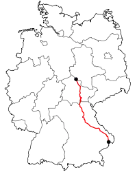 Cities and towns along Biểuchieu: Berga (Kyffhäuser)Bad FrankenhausenKölledaWeimarRudolstadtSaalfeld/SaaleKronachKulmbachBayreuthPegnitzAuerbach in der OberpfalzSulzbach-RosenbergAmbergSchwandorfRodingChamViechtachRegenSchönberg (Lower Bavaria)Passau