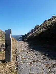 The Bungo Kaidō was established in 1601 by Katō Kiyomasa, and was an important link between the castle town of Kumamoto and the Tsurusaki area of Bungo Province in the modern-day Ōita Prefecture.[1] After Toyotomi Hideyoshi unified the nation and Kiyomasa entered Higo to rule the province, Katō traveled the route to the port of Tsurusaki.[2] Then he reached Osaka through the Seto Inland Sea and headed to Edo by foot.[2] Early in the Edo period, travel along the road mostly consisted of Kumamoto Domain heading towards Edo in order to take part in sankin-kōtai.[1]