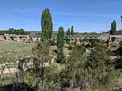 The bridges were first built by contractors Johnston & Co. in 1885–87 along with the extension of the railway from Bungendore to Michelago through Queanbeyan. The Molonglo River bridge was completed in May 1886 and the Queanbeyan River bridge in July 1887, both opening with the line in September 1887. The original bridges consisted of arched hardwood timber girders on brick piers and stone abutments, featuring four spans (Molonglo River) and five spans (Queanbeyan River) of 24 metres (80 ft) each. The stone for the abutments came from the quarries at Pyrmont in Sydney. A temporary bridge over the Queanbeyan River during construction was reported at the time to be the largest temporary railway bridge ever constructed in New South Wales.[2][3][4][5][6][7]