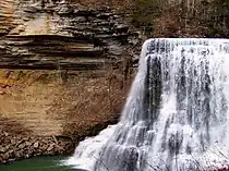 The Falling Water River rises near the base of the Cumberland Plateau in eastern Putnam County and winds its way across the Highland Rim to its mouth along the Center Hill Lake impoundment of the Caney Fork, which is located in an area where the Highland Rim drops off into the Central Basin. The Burgess Falls State Natural Area comprises the section of the river just above its mouth, where the river drops from roughly 900 feet (270 m) atop the Highland Rim to just over 600 feet (180 m) at Center Hill Lake.