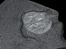 The body had an unsegmented approximately circular carapace that was somewhat convex. It was likely thin and had only weak sclerotization. A pair of tapering flexible segmented antennae projected forwards from the head, which were about equal in length to the carapace, these were likely tactile in function. There are three pairs of cephalic appendages excluding the antennae that functioned as walking limbs, as well as seven pairs of biramous walking limbs with gills, otherwise similar to the cephalic limbs running along the trunk, which decreased in size posteriorly. Although not visible on any specimens, the mouth was almost certainly located on the underside of the body. The circular carapace was largely occupied by the guts, which were divided into two sections on either side of the carapace.[2] The body ended with a long telson, which was moveable and could either be rigid or flexible, which was likely controlled by the injection/withdrawal of fluid from a cavity within the telson and the corresponding increase/decrease of hydrostatic pressure. It was probably used to turn the animal upright if it became overturned.[1]