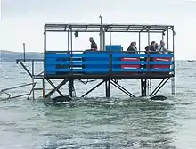 The island is approximately 270 yards (250 m) from the mainland at Bigbury-on-Sea and is approachable on foot at low tide.[15] At high tide, the sea tractor, which is operated by the hotel, transports passengers back and forth.[17] The original vehicle was constructed in 1930 (see 1933 photo); the current third generation tractor dates from 1969.[20] The vehicle drives across the beach with its wheels underwater on the sandy bottom while its driver and passengers sit on a platform high above. Power from a Fordson tractor engine is relayed to the wheels via hydraulic motors.[21]