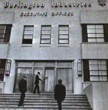 During World War II Burlington Mills sold nylon parachute cloth to the United States government.[3] About 4,000 male employees served in the war and were replaced by female workers.[5] Following the war the company diversified its operations, offering cotton and nylon commercial products, and it rapidly expanded.[5][8] It also invested $50 million in revamping and expanding its facilities.[9] In 1952 it became the first textile corporation to create a television advertisement.[5] By then it was the largest synthetic textile producer in the world, overseeing 73 facilities and 31,000 workers. Three years later the company was reorganized as Burlington Industries with nine different divisions.[7] In 1961 Fortune listed Burlington Industries as the 48th largest American corporation, with sales of $913 million and 62,000 employees in and outside of the country.[8] Love died the following year and the company came under new management.[5] In 1970 the company opened a new headquarters building in Greensboro, designed by Odell Associates.[10]