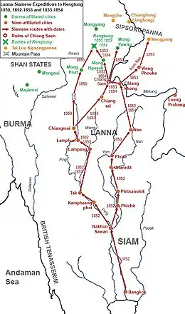 ![]() Lanna-Siamese Expeditions to Kengtung in 1850, 1852-1853 and 1853-1854 Green represents Shan States under Burmese suzerainty including Kengtung. Red represents Lanna-Siam. | |||||||