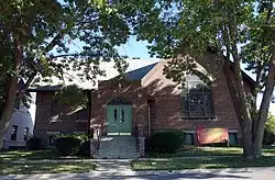 The German Methodist congregation built the historic building in 1912. It was designed by the Des Moines architectural firm of Wetherell and Gage.[3] The single-story brick building was built on a raised basement. The sanctuary is on the east side of the building and the pastor's study and classrooms are located on the west side. The two sides sit at right angles to each other with a small, gable-roofed entrance with a parapet set into the angle of the two sections. Most of the windows on the main floor are Tudor arches with brick hoods. The exception is the large Gothic arch window in the sanctuary. There is also half-timberwork on the west elevation.