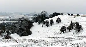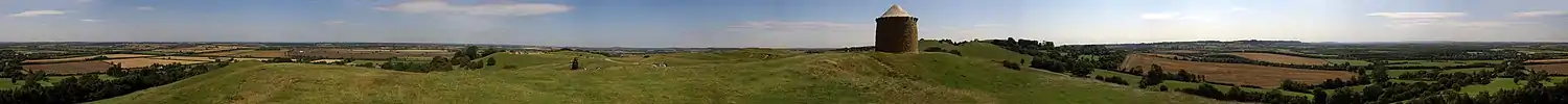 Impressive views across the surrounding countryside can be seen from the hills; towns and other features that are viewable are described by a toposcope. On a clear day, places as far afield as Coventry (more than 20 miles away) can be seen. The park and the church were used as a location in the Tom Selleck 1990 film Three Men and a Little Lady.