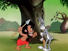 After a wild ride inside the kangaroo's pouch, Bugs gets out and is then struck by a boomerang thrown by an aborigine, whom Bugs later calls "Nature Boy". Bugs throws the boomerang away but it hits him again. Nature Boy confronts Bugs, who teases him into a yelling fit. Nature Boy throws his spear at Bugs, who runs and dives into a rabbit hole. Bugs tricks Nature Boy into thinking he's stabbing the rabbit down the hole, then kicks the man down into the hole.