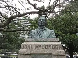 A bust of John McDonogh was installed in New Orleans, Louisiana, United States in 1938, as part of the Federal Art Project. It was created by Angela Gregory,[1] a New Orleans native, and was erected at what was designated "McDonogh Place", a small park in Uptown New Orleans at St. Charles Avenue and Toledano Street. In 1958, it was moved to Duncan Plaza by the new City Hall. The artwork was surveyed by the Smithsonian Institution's "Save Outdoor Sculpture!" program in 1993.[2]