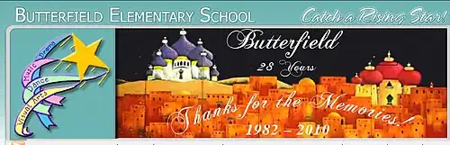 An event called "Celebrate Butterfield" was held for the community on May 8, 2010,[14] with a review of the school's history, as well as a reunion of present and past parents, students and teachers.[15][16][17] The doors closed forever as the children left for the last time on June 3, 2010.[18] The school's final musical, a performance of Honk Jr. was held on June 6, 2010.[19] In its closing year, the Butterfield Elementary API tests scores increased to 853, a growth of 76 points,[20] the second largest elementary increase in all of Riverside and San Bernardino counties.