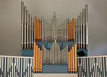 The altarpiece is a glass mosaic with metal and a gold-plated field created by Veslemøy Nystedt Stoltenberg in 1995. There is a large cross that is made of brass with turquoise, molded pieces of vitreous enamel at the side wall. The pulpit and the baptismal font are designed by the architect. The church has a church organ with 15 voices. To the west are copper doors with reliefs, created by Ørnulf Bast.[2][4][5]