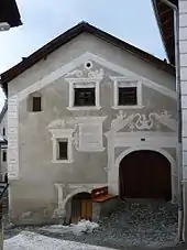 The Engadine house which emerged in the 15th/16th centuries, especially in the Engadine, is a typical byre-dwelling. It is a solid, stone building, usually with a wooden core, which comprises domestic and working areas, one behind the other, under a single, broad saddle roof. The domestic and working areas cover three storeys, with a gate on the lower and ground floors. On the lower floor is the byre (Stallhof or Cuort) with access to the cattle bays and cellars. At the front of the ground floor storey is the vestibule (Sulèr, pietan) leading to the living quarters: the parlour (Stube), kitchen (Küche), larder (Vorratskammer) and, at the back, the barn (Scheune) for the hay. A haycart (Heukarren, tragliun) could only be taken through the upper gate or the vestibule into the barn. On the upper storey (Palatschin) are the bedrooms. The sitting room has the only stove, which heated the living quarters from the kitchen outwards. While the division of the rooms and the position of the windows and oriels (with their view of the well) were based mainly on practical considerations, the facades of Engadine houses were often richly decorated with murals and sgraffiti.
