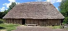 In England too, there was a very similar type of dwelling, of which remains survive in the southwest, for example in the longhouse variants of Dartmoor, in Cornwall or in Wales. In Ireland there are similar byre-dwellings, albeit the fireplace here appears to have been placed against a gable wall.[4] In northwestern England this type of dwelling is also described in the Cumbrian countryside.[5]